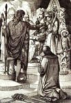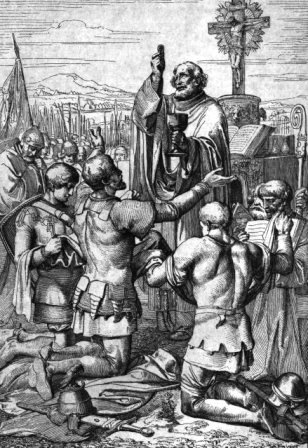 Der Bischof von Augsburg reicht am Schlachtfeld dem knieenden König den Leib des Herrn und verrichtet die heilige Messe.