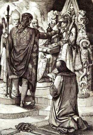 Heinrich sitzt am Vogelherd, als ihm die Botschaft von der Königswahl mit den Reichsinsignien überbracht wurde.