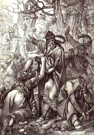 Bonifatius legt die Axt an eine dem Donnergott geheiligte Eiche und fällt diese, zum Erstaunen aller Anwesenden, zu Boden.