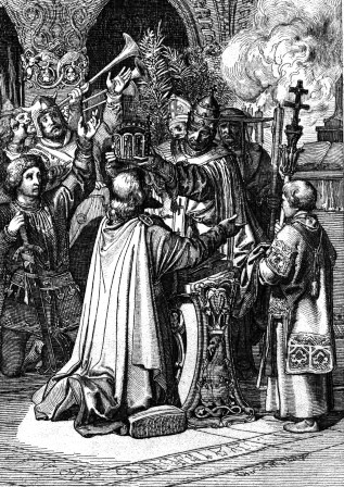 Ludwig kniet in der Kirche vor dem Altar, legt sein Wehrgehänge ab und empfängt von den Priestern das Büßerkleid