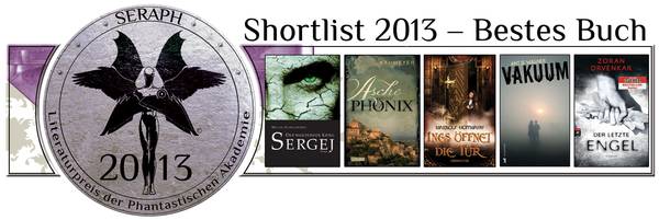 Am Donnerstag, den 14. März 2013 um 17:00 Uhr fand auf der Leseinsel Fantasy in Halle 2, Stand G 307/H 308 die Seraph-Preisverleihung 2013 statt. Zum zweiten Mal in der Geschichte der Phantastischen Akademie e.V. wurde der Preis für Phantastische Literatur in den Kategorien Bestes Buch und Bester Debütroman des Jahres 2012 verliehen.