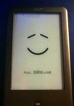 Interessant war, dass mir der tolino nicht nur technisch und praktisch sympathisch war, sondern auch aufgrund seines Ruhe-Bildschirms. Das lächelnde Gesicht und der Hinweis, dass der tolino schläft, wirkten auf mich sehr ansprechend; viel ansprechender, als eben ein weiteres abgeschaltetes Gerät mit leerem Display.