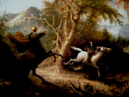 Als die Stunde heranrückte, in welcher der Hesse durch die Lande ritt, pfiff er schwach, um sich Mut zu machen. Aber als er zur gefürchteten Stelle kam, brach er das Pfeifen in einem Atemzug ab, weil er den Schritt eines Pferdes hörte. Als er sich umdrehte, sträubten sich seine Haare. Sein pochendes Herz schien ihm den Atem zu nehmen, weil er einen kopflosen Reiter auf dem Bergrücken hinter sich sah, welcher sich als schwarze Gestalt gegen den Sternenhimmel abhob. Er gab seinem Gaul die Sporen, in der Hoffnung, als Erster die Sleepy-Hollow-Brücke zu erreichen, welche die Spukgestalt bisher nie überquert hatte. Der unglückliche Mann gab sein Bestes, so schnell wie möglich zur Brücke zu gelangen, damit ihn sein Verfolger nicht einholen konnte. Noch eine Minute und die Brücke würde erreicht sein. Jedoch zu Ichabods Grausen holte der Hesse auf, stieg in die Steigbügel und warf seinen Kopf in den Rücken des Flüchtenden. Mit einem Schrei des Entsetzens fiel der Schulmeister in eine Menge Unkraut am Wegrand und blieb dort für einige Minuten bei Bewusstsein, jedoch sich an nichts erinnernd liegen.