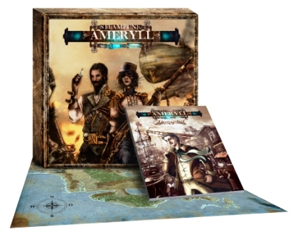 Steampunk – Ameryll erscheint 2015 als klassisches Tischrollenspiel in einer Box, aber auch als Romanserie, zuerst als deutsche Version, später auch als englische. Eine Kickstarter-Kampagne ist ebenfalls gestartet, hier locken spannende Belohnungen für jeden Unterstützer.