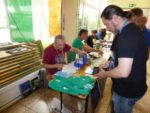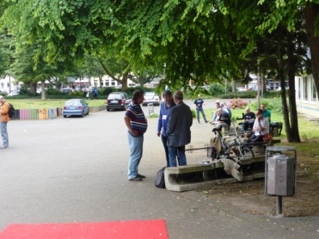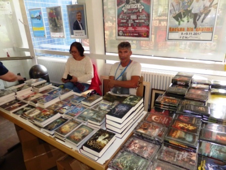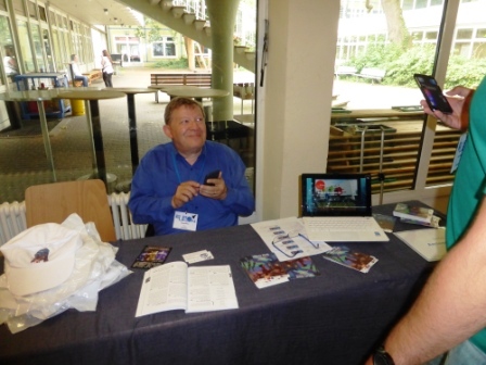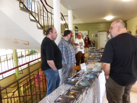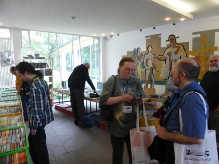 Am nächsten Morgen kam das Aufbauen. Das hieß für mich, ich bin mit dem Verlag Saphir im Stahl und den neu dazugekommenen Arcanum Fantasy Verlag und Scratch Verlag als Standbetreiber dort gewesen. Ich hatte das Buch In mehr als 80 SF-Geschichten um die Welt dabei, das beim Kurd-Laßwitz-Preis den 3. Platz in der Kategorie Sonderpreis erhielt. Gewöhnlich verkaufe ich auf Cons maximal ein Exemplar des relativ teuren Buches. Hier war ich sehr schnell die Bücher los, da auch europäische SF-Fans an dem deutschsprachigen Buch Interesse hatten. Besonders erfreut war ich, als ich Frank Roger (belgischer Beitrag), Julie Novakova (tschechischer Beitrag) sowie Carlos (argentinischer Beitrag) auf diesem Con begrüßen und kennenlernen durfte. In meinem berüchtigten Denglisch konnte ich mich doch einigermaßen mit Händen und Füßen zusätzlich verständlich machen. Auch Tanja Bröse-Kronz, eine der Übersetzerinnen war anwesend. Daraus ergab sich natürlich, dass sich Übersetzerin und Autorin kennenlernen konnten.