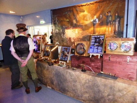Was gab es sonst noch auf dem Con, bemerkenswert, merkwürdig und sonst? Nun, da ist erst einmal Jürgen Lautners Steampunkbastelei zu nennen. Was Jürgen baut und vorstellt, ist Extraklasse. Besonders gefiel mir ja, dass er das Thema Raumpatrouille Orion aufgriff. Ich bin ein großer Fan der Serie und schaue mir gerade die alten Filme mit Susanne noch einmal an. Für Susanne hingegen völliges Neuland. In meinem Verlag Saphir im Stahl habe ich drei Bücher zur Fernsehserie Orion mit den sieben Folgen in drei Büchern herausgebracht. Und was macht unser Steampunker aus Orion? Einige Modelle, die er Aetherpartouille Orion nennt. Zinnfiguren, Zeppeline mit Gondeln, die an Orion erinnern, eine Figur, die ihn darstellt im Kampf gegen einen der Roboter aus Orion … und einiges mehr. Seine Modelle zeichnen sich durch besondere Detailtreue aus, eine gelungene Bemalung, und eine stimmungsvolle Präsentation.