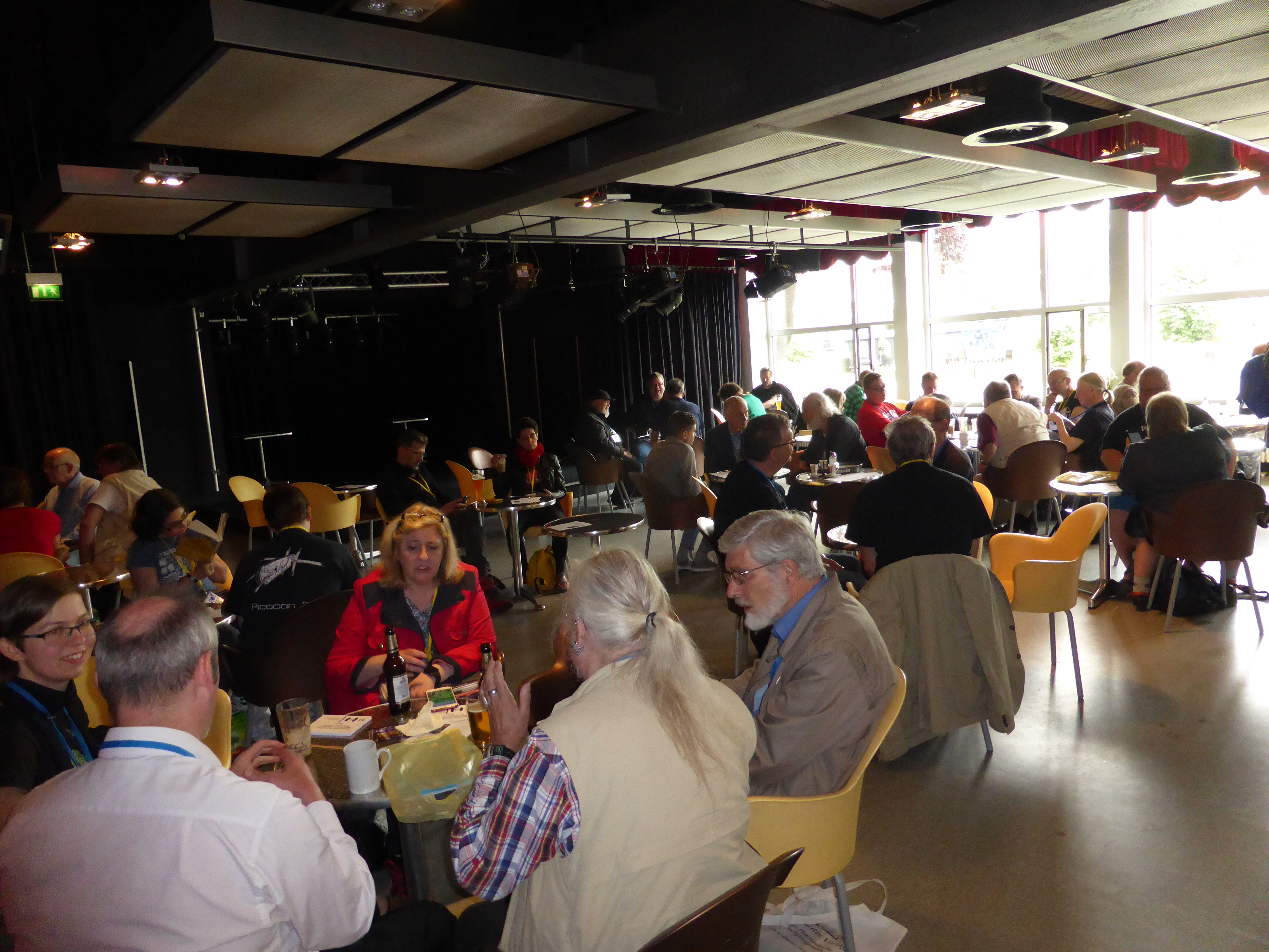 Wie gewöhnlich gehe ich immer herum, begrüße die anderen Standbetreiber, von denen ich viele kannte und auch Besucher, mit denen ich schon öfters gesprochen hatte. Dafür, dass ich zum ersten Mal auf einem Dortcon und einem Eurocon war, kannte ich doch relativ viele Besucher, Händler, Helfer und … Man kann gar nicht alle aufzählen. Mit meinem »Ich bin dann mal eben weg« und »Ich gehe mal kurz Fotos machen« hatte ich es wohl übertrieben. Susanne musste öfters hinter mir herlaufen und zum Stand zurückzerren, weil jemand etwas von mir wollte. Daher durfte ich am Sonntag den Stand nur noch mit Erlaubnis verlassen. Dabei hatte ich nicht das Gefühl, dass viele Besucher da waren. Oft gab es Leerlauf am Stand. Dafür waren die vielen unterschiedlichen und zum Teil zweisprachigen Veranstaltungen gut besucht. Auch das Cafe war als Treffpunkt gern genutzt.