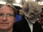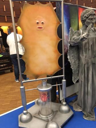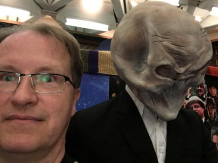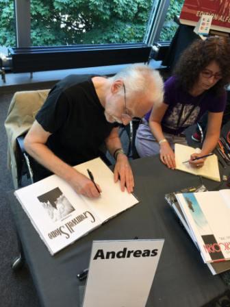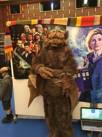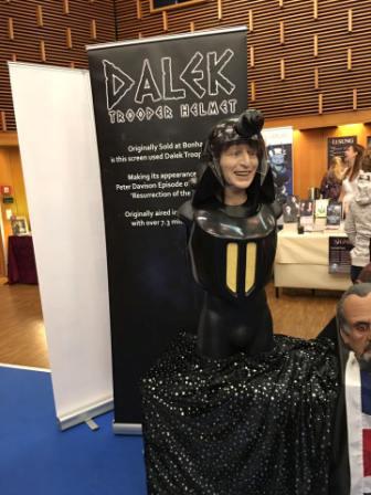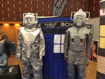 In den folgenden Stunden zog ich im Wesentlichen mehrfach über die Gänge zwischen Catering (lecker und mit angemessenen Preisen) und den Sälen London, Brüssel und Oslo/Helsinki hin und her, traf einige Mitglieder der Phantastikfamilie wie z. B. die unermüdlichen Tina und Thorsten Low, Autoren wie Holger M. Pohl, Dirk van den Boom und Axel Kruse, und nicht zuletzt die Crew des SFCD. Insgesamt machten aber m. E. Phantastikinteressierte jenseits des Fandoms einen Großteil der Gäste aus, was, soweit ich es verstanden habe, auch ein Ziel der Phantastika war. Mehrfach für längere Zeit blieb ich in der Doctor Who-Ausstellung von Rockin Robin hängen. Wie praktisch, dass Familie Vogel mit ihrem Old Rocketman Weltraumbasar ganz in der Nähe zu finden war, sodass ich nicht ganz ohne ein Mitbringsel aus der Welt des Doctors nach Hause gehen musste. Und natürlich habe ich doch wieder ein Buch gekauft. Nein, diesmal nicht von Dirk van den Boom, sondern den Comic Cromwell Stone von Andreas. Signiert am Schreiber und Leser-Verlagsstand vom Zeichner selbst – freu!