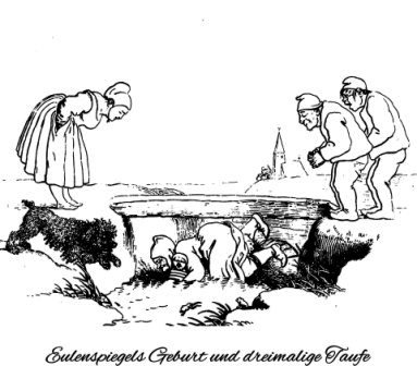 s war einst in einer niedersächsischen waldigen Gegend ein Dorf, welches Knetlingen genannt ward, daselbst wurde das seltsame Kind Eulenspiegel geboren. Sein Vater hieß Claus Eulenspiegel, und die Mutter Anna Weibekin. Als das Kind geboren war, schickten sie es nach Amtleben zur heiligen Taufe. (Bei Amtleben war sonst ein altes Schloss, welches auch so genannt wurde, das aber von den Magdeburgern und anderen Nachbarn als ein Raubnest im Krieg zerstört worden ist.) Bei dieser Taufe erhielt das Kind den Namen Till Eulenspiegel. Als nun die Taufhandlung verrichtet war, begab sich die Wehmutter mit den Taufzeugen in das Bierhaus, um nach damaligem Gebrauch, erst auf des Vaters, der Mutter und des Kindes Gesundheit und Wohlsein sich gütlich zu tun, damit sie es bei der gerade stattfindenden Hitze auf ihrem Weg nach Hause aushalten könnten. Hier hatte aber die Wehmutter, als auch die Gevattern etwas zu tief in das Glas geguckt, wie man zu sagen pflegt. Nun mussten diese ziemlich berauschten Leute auf einem schmalen Steg über einen etwas tiefen Bach gehen: Siehe, da war der Wehmutter der Kopf schwerer als der ganze Leib, und sie fiel mit dem jungen Weltbürger ins Wasser und besudelte sich mit Schlamm. Doch weil Unkraut nicht leicht verdirbt, so geschah auch diesem Kind kein Leid. Hiervon sagten die Leute damals, dass Eulenspiegel als Kind dreimal getauft sei, erstens in der Kirche, zweitens im Wirtshaus und drittens im Bach. Das war eine Vorbedeutung zu Till Eulenspiegels schalkhaften Lebensbegebenheiten.