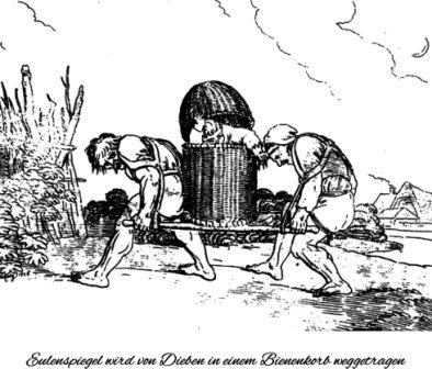 Eulenspiegel kriecht in einen großen Bienenkorb, schläft darin ein und wird von den Dieben weggetragen.