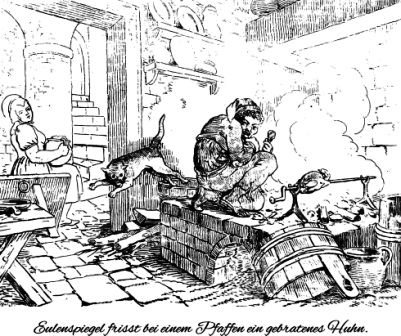 Der Priester ging in die Küche und sagte zu Eulenspiegel: »Wie kannst du dich unterstehen, meine Magd zu verspotten? Sehe ich doch selbst, dass nur ein Huhn am Spieß ist, und sind doch zwei daran gewesen.«