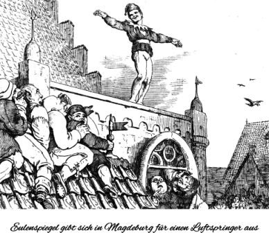 Eulenspiegel gibt sich in Magdeburg für einen Luftspringer aus.