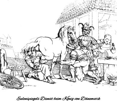 Eulenspiegel musste aber die goldenen Hufeisen wieder abreißen und gewöhnliche aufschlagen lassen. Danach blieb er als Hofnarr bei dem Dänenkönig mehrere Jahre.