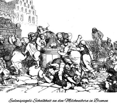 ls nun Eulenspiegel endlich nach Bremen kam und in der Altstadt umherging, bemerkte er, dass viele Mädchen aus den Vorstädten mit Milch zur Stadt kamen und solche zum Verkauf anboten. Hier, dachte Eulenspiegel, ist es Zeit, den Milchmädchen einen tüchtigen Possen zu spielen, weil er gesehen hatte, wie sie die Milch mit Wasser verfälschten, um desto mehr Geld daraus zu lösen. Zum Zweck kaufte er eine große Tonne, stellte sie auf den Markt und blieb dabei stehen.