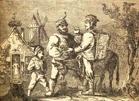 Kaum hatte er das gesagt, als ein stattlicher Esel vor ihm stand. Der Glaser setzte sich fröhlich auf und ritt getrost zur Mühle. Dort bot er dem Müller den Esel für zehn Taler an. Nach einigem Hin und Her zahlte ihm der Müller neun Taler, mit denen der Glaser zufrieden davonritt. Nun ließ der Müller den Esel von seinem Knecht in den Stall bringen.