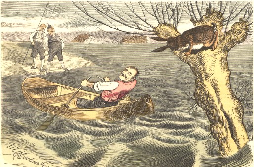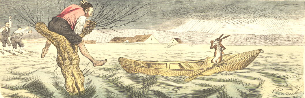 | Entschlossen schnell – gesagt, getan – Der Bauer sitzt auch schon im Kahn Und rudert mit Geschick und Mut Zum Baum hin durch die Wasserflut. |