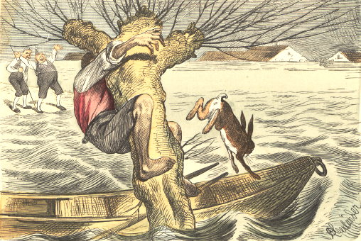Doch wie der Kunz den Baum besteigt, Dem Hasen sich ein Ausweg zeigt. Er springt – was konnte besser sein? Stracks in den losen Kahn hinein. |