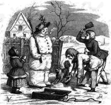 So wälzten sie große Bälle und setzten einen auf den anderen. Als sie nicht mehr hinaufreichen konnten, stellten sie sich auf einen Stuhl, hoben einen großen Ball hinauf und setzten ihn als Kopf oben auf den Rumpf. Dann drückten sie statt der Augen ein paar schwarze Kohlen hinein, statt des Mundes einen breiten roten Ziegelstein und in die Hand gaben sie ihm einen dicken Stock. So war der Schneemann fertig. Er stand gerade vor dem Stubenfenster und es sah aus, als ob er in die Stube hineinsehen wollte.